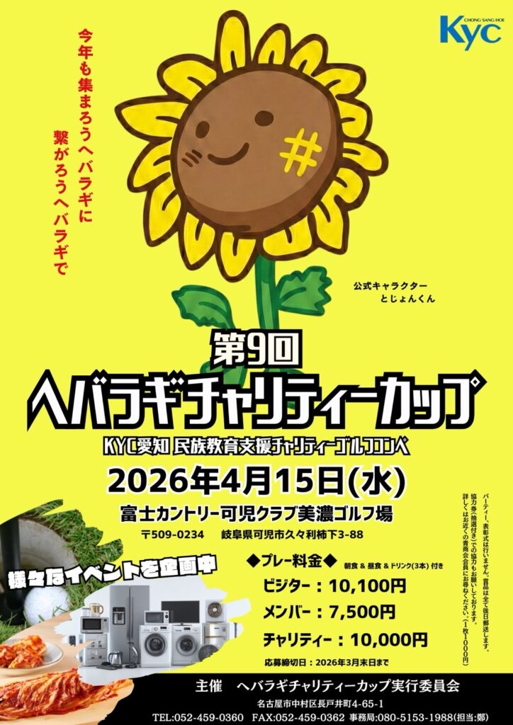 〈第9回ヘバラギチャリティーカップ〉開催のお知らせ 日時:2026年4月15日(水) 場所:富士カントリー可児クラブ美濃ゴルフ場 〒509-0234岐阜県可児市久々利柿下3-88 今回も多数のご参加をお待ちしております! 民族教育支援の為に… 〈第8回ヘバラギチャリティーカップ集合写真〉 今年も集まろうヘバラギに 繋がろうヘバラギで!